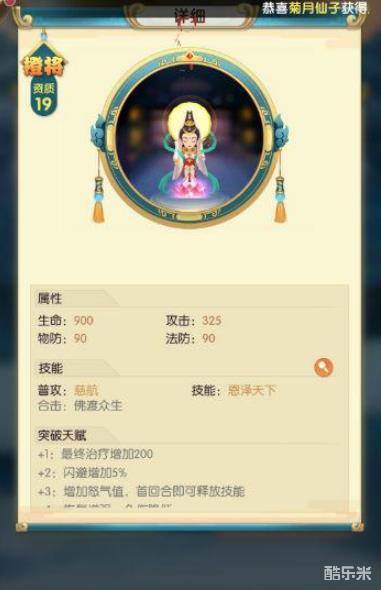观音菩萨是一个19资质的橙色伙伴,普通技能能够给己方生命最低的单体进行治疗。技能方面,同样是给己方生命值最低的单体进行治疗,附带2回合的无敌效果,持续时间和效果都还是很不错的,大大加强己方队友的生存能力。美中不足的地方在于是单体范围,但是这种BUG级别的效果,单体范围也算是正常了。合击技能上能够对范围敌人造成伤害,附带持续流血效果,伤害量还是有的,并且能够降低敌人伤害,减少对己方的输出,也算是提升了己方的防御能力吧。