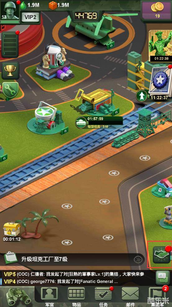 加入集团军后,玩家可从主界面的快捷入口进入集团军帮助,帮助集团军内其他的小伙伴生产建筑,缩短时间,还会获得少量材料奖励。