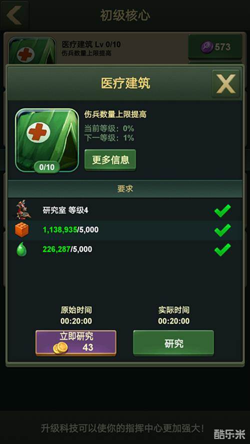 而在研究室研究科技可以提高伤兵数量上限,增加伤兵容量,增加伤兵恢复速度,可全方位提升您的实力。