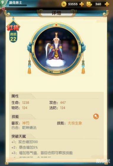 太乙真人是一个22资质的红色伙伴,普通攻击能够对单体前排造成伤害。技能方面,能够对前排范围敌人造成伤害,附带驱散目标增益效果,这个还不是最重要的,最重要的在后续所增加的被驱散目标将被清空怒气效果,能够大大影响敌人前排技能释放,在竞技PK中的作用尤为明显,这个谁用谁知道。合击技能上海能够将敌人前排进行控制,虽然几率不高,但总比没有好。同时还能使己方攻击敌人前排使获得生命恢复,实用性很强。
