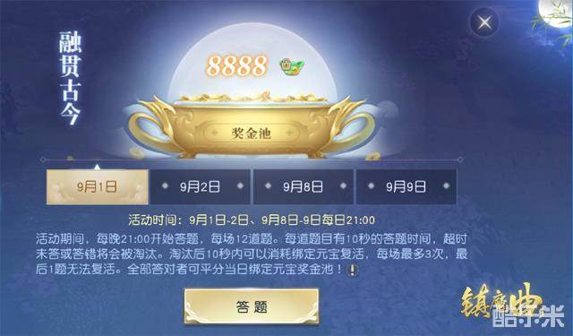 如果你对自己的知识量引以为傲,可以在9月1日、2日及8日、9日四天参与“融贯古今”答题闯关活动。每场12题、每题10秒作答,成功闯关即分享绑定元宝奖金——万一答错也不怕,除了最后一题,每场都有3次复活机会!