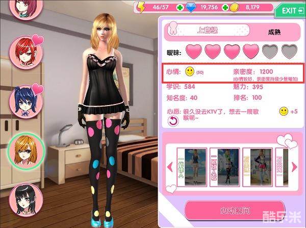 获得女友的时候,女友的心情值初始为50。这50有什么用呢?右方的亲密度下方那行小字其实就是心情的作用。女友的心情好的时候,女友的亲密度每小时会自动增加。增加的值与具体的心情有关。若心情>=80时,亲密度大幅增加;50=<心情<80时,亲密度少量增加;20<=心情<50时,亲密度不变;当然女友心情不好的时候,亲密度也会持续减少,心情<20时,亲密度就会减少。