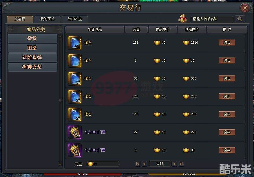大家在交易行的“交易行”界面里,可以选购各种杂货、图鉴、进阶系统、海神套装等类型物品,大家可按照分类或通过输入物品名称来搜索。大家找到要购买的物品后,可结合物品的数量、单价、总结来购买。点击物品后面的“购买”按钮,并调整好购买的数量,就能消耗非绑定元宝,将该物品购买回自己的背包里。