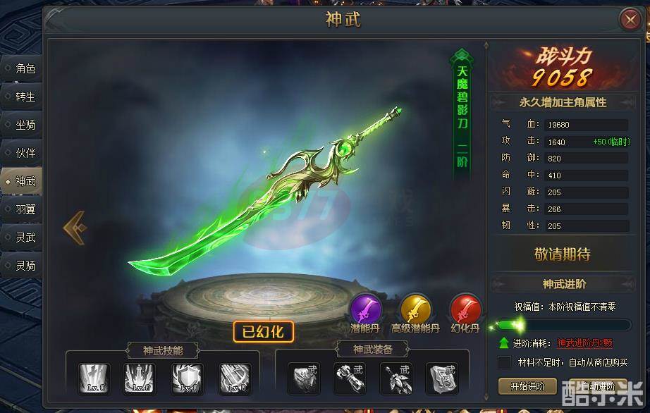 大家可消耗【神武进阶丹】的道具,来对神武进行升阶。进阶有一定成功几率,进阶是会积累一定祝福值,3阶以上的神武进阶祝福值,会在24小时进行清空处理。大家在进阶神武时,就要注意进阶材料的收集了。尽可能一次性进阶成功,避免浪费进阶材料。