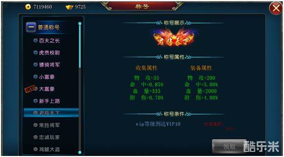 顾名思义,VIP等级称号就是达到VIP等级即可领取的称号。目前在《斩魔》中,共有4个这样的称号,分别是VI-百夫之长、V3-虎贲校尉、V6骠骑将军、V10君临天下,称号的属性随着VIP等级提升而增加。