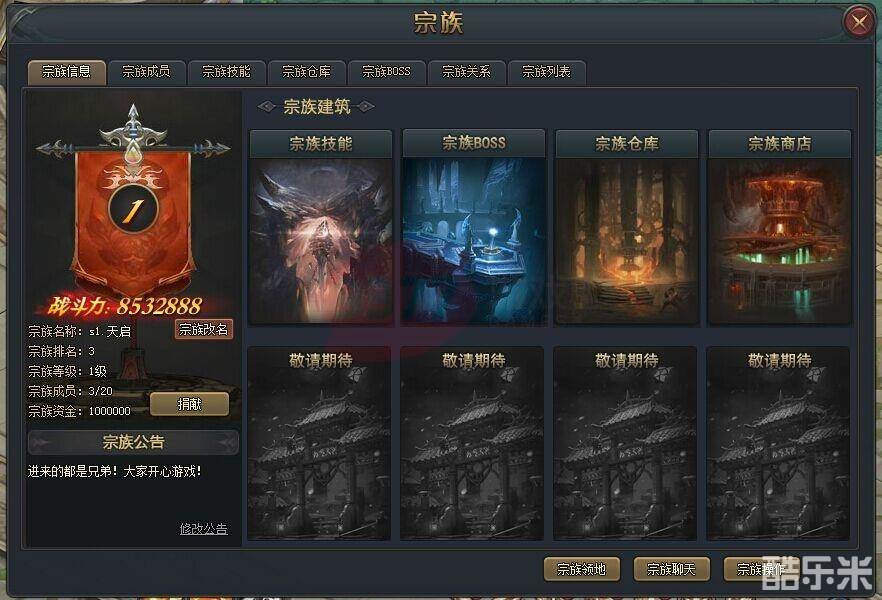 玩家成功加入宗族之后,可学习宗族技能、使用宗族仓库、挑战宗族BOSS、使用宗族商店等,而且还能参加夺城战的竞技活动哦。