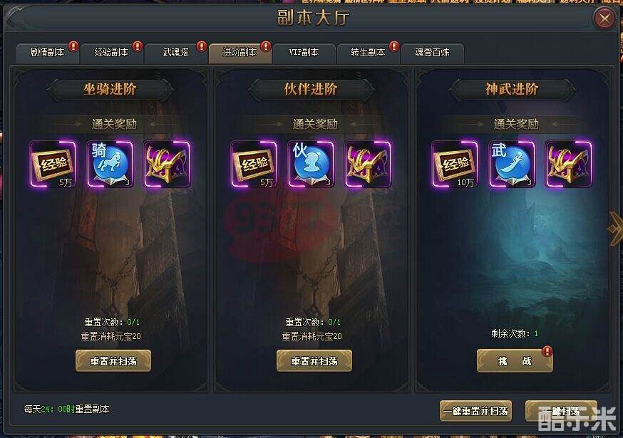 目前,斗罗大陆2D进阶副本共有6个,分别有坐骑进阶副本、伙伴进阶副本、神武进阶副本、羽翼进阶副本、灵武进阶副本、灵武进阶副本、灵骑进阶副本。玩家要达到指定等级后,才能挑战各种进阶副本的。这些进阶副本每天有一次挑战机会,每天24点将会重置副本次数。