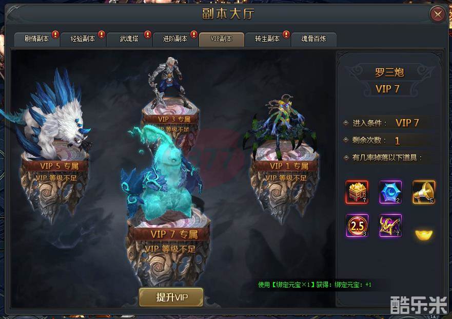 玩家进入到VIP副本内,要在规定的时间段内,将副本内的怪物消灭掉,才能通关副本获得对应奖励品。斗罗大陆2DVIP副本掉落奖励有装备炼品盒、升星石、喇叭、多倍收益丹、进阶丹礼盒等。
