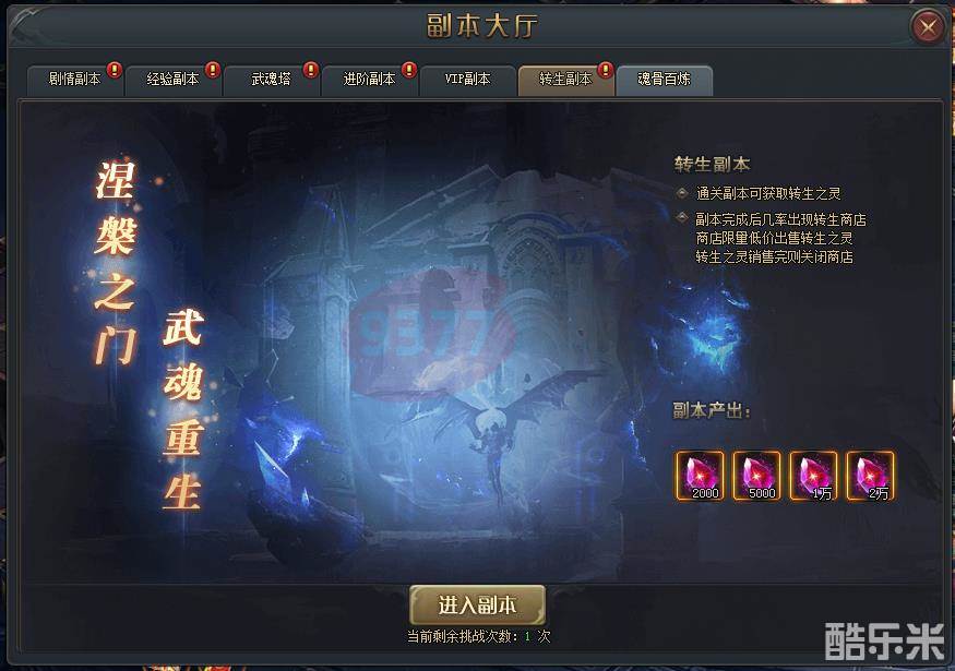 玩家从副本大厅里进入,就能找到转生副本的进入口。玩家进入副本后,可根据副本内的要求,消灭副本内的所有怪物,将副本进度完成到100%,就能通关副本获得一些转生之灵奖励。玩家在领取通关奖励时,可选择绑定元宝或非绑定元宝,来领取多倍奖励。3倍和5倍的领取,需要角色达到指定VIP等级的哦。