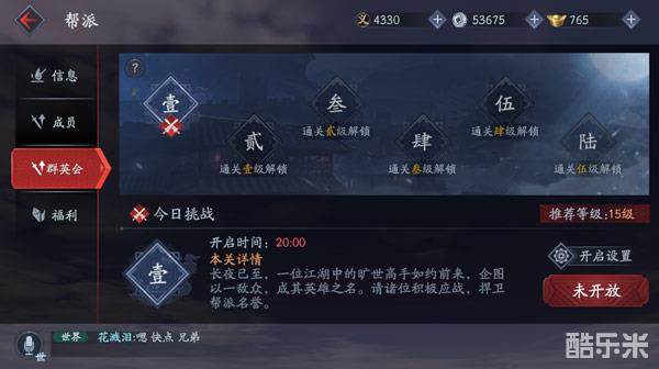 加入帮会后,少侠可参与群英会。群英会,是帮派全员协力挑战的超难关卡玩法。场内最多同时上场3名成员,其余成员可观战待命。当场上成员战斗时间结束或死亡,则退场进入观战待命队列,由待命成员顶替上场。