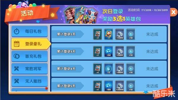 累计登录可获得丰厚奖励,天数越多,礼物越豪。次日登录可获得奖励3选1英雄包!连续7日登录,更可获得史诗召唤书!