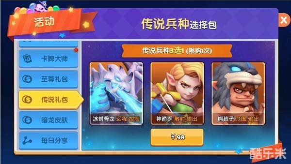 三大最强兵种来袭:冰封骨龙、神箭手、熊孩子,暗影之怒巅峰战力的代表。每个账号只有一次购买机会,只需98元既可获得最强兵种。