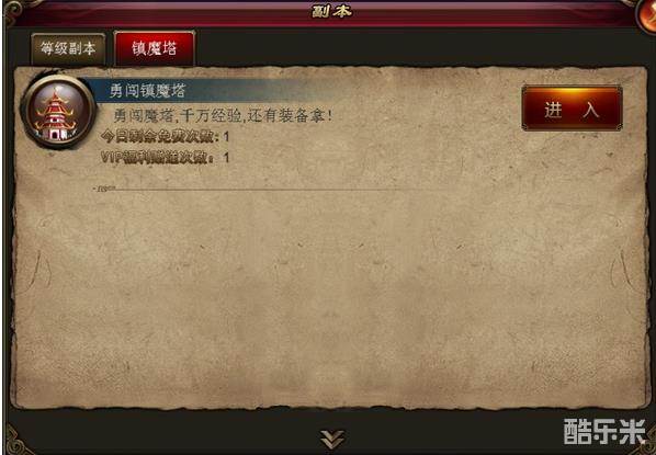 等级达到40级的玩家,可以打开主界面的【进入副本】—【等级副本】—【勇闯镇魔塔】。达到所有守卫怪物之后,寻找到NPC镇魔塔使者,点击他,即可选择进入下一层。