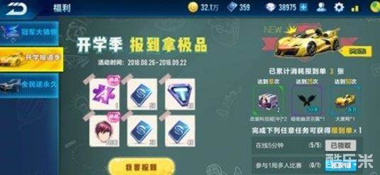 开学季,减负季,登录就送报到单。9月1日-9月9日期间,登录就能免费领取报到单*1,累计报到达到指定次数即可获得科技点宝箱、暗夜幽灵羽翼和永久大黄鸭赛车奖励!