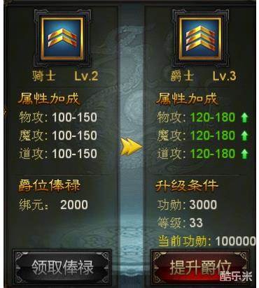 提升爵位能够增加角色的物攻、魔攻、道攻属性,从而提升战斗力,角色的一些高级装备是需要玩家达到一定的爵位才能够装备的。每个级别的爵位属性肯定是有区别的,每升一级都能让战力飙升,最高一级爵位应该是亲王。