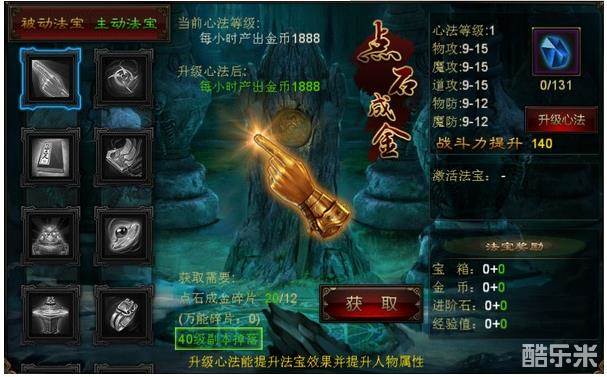 玩家激活法宝后,可以使用法宝进阶石来升级心法等级,提升心法等级可以加成角色物攻、魔攻、道攻、物防、魔防属性,从而提升一定的战斗力。法宝进阶石可以通过击杀世界BOSS和60级怪物获得。