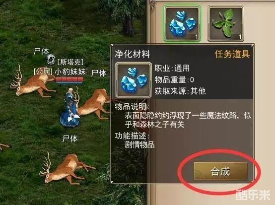 机智的小豹发现,【树叶】和【净化材料】可以合成为【寒晶体】,这个发现非同小可,小豹当机立断将【寒晶体】带回去给鲁温学士看看。