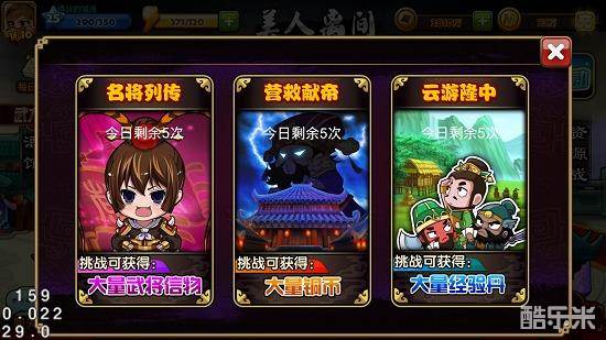 玩家城池达到22级开放,活动副本包括:名将列传(挑战可获得大量武将信物);营救献帝(挑战可获得大量铜币);云游隆中(挑战可获得大量经验丹)