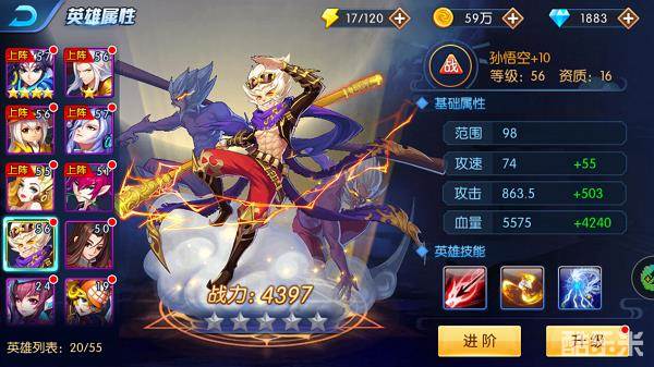 3、进阶数,通过英雄进阶提高战斗力,10阶以后对技能也有一定提升。