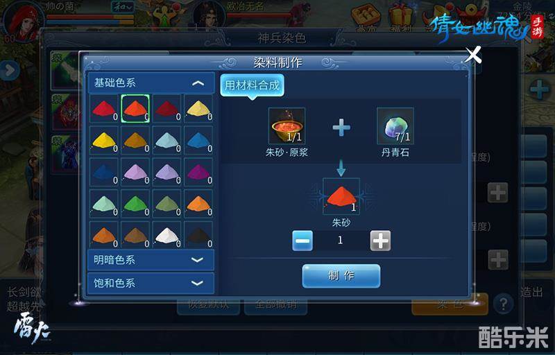 玩家可以使用道具合成部分染料,同时通过合成不同颜色的方式可以获得一些颜色特殊的染料。使用这些染料可以对装备进行染色,染色结果将由基础色、明暗度和饱和色三种属性决定。
