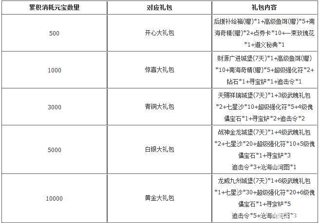 1、活动期间(2013年7月9日00:00~7月15日23:59),在游戏中累积消费七雄元宝,可获得对应礼包一个。 注:武将高级修炼、黄金修炼、白银修炼消耗的元宝不计算在本次活动中。
