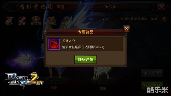 值得一提的是,作为现目前《全民奇迹MU》之中唯一采用双人竞技模式的活动,情侣竞技场同样也不遑多让的在3.0大版本中上线了专属饰品“相守之心”,凡段位达到厮守的夫妻,都能够获取到这枚象征着爱与力量的专属饰品。
