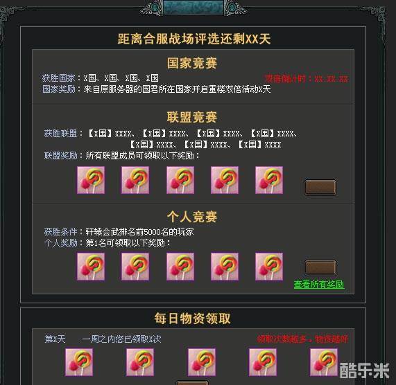 合服开始的一个月内,将有国家竞赛、联盟竞赛以及个人竞赛等热闹的活动等你参加,每日还能领取丰厚的物资奖励。