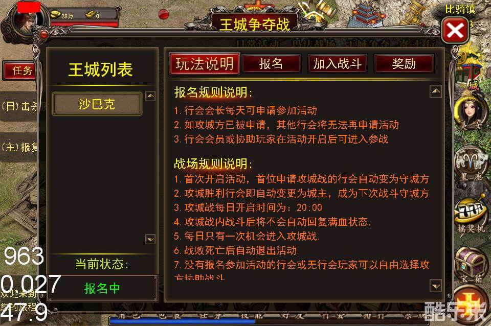 7.没有报名参加活动的行会或无行会玩家可以自动选择攻守方协助参加战斗