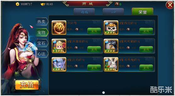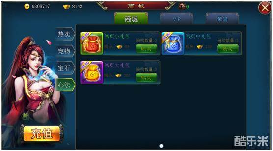 在商城中,共有“热卖”、“宠物”、“宝石”、“心法”四类分栏,供您随意挑选,各类礼包比单买的价格更加实惠哦!不过一些商品每天具有一定的限购数量,所以要囤货的小伙伴要注意咯!