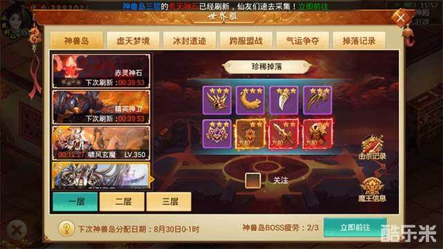 神兽岛中分布着可采集的普通材料精元碎晶与高级材料赤灵神石、灸天神石、焚世神石,高级材料有机会开出稀有神兽装备,集齐相应的装备可以激活强大的助战神兽,让你的战力飞速提升。此外,岛上各处还分布着不同等级的神秘BOSS,挑战胜利有机会获得高阶装备和珍稀兽装。当然,作为跨服副本,神兽岛上还汇聚了来自不同服务器的侠客,高手之间相互过招在所难免。如果实力不足,到手的BOSS也可能被抢走哦。
