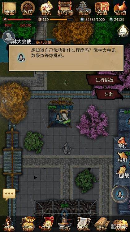 在九州各大城池中,皆设有武林大会使,玩家可随时到武林大会使发起挑战。
