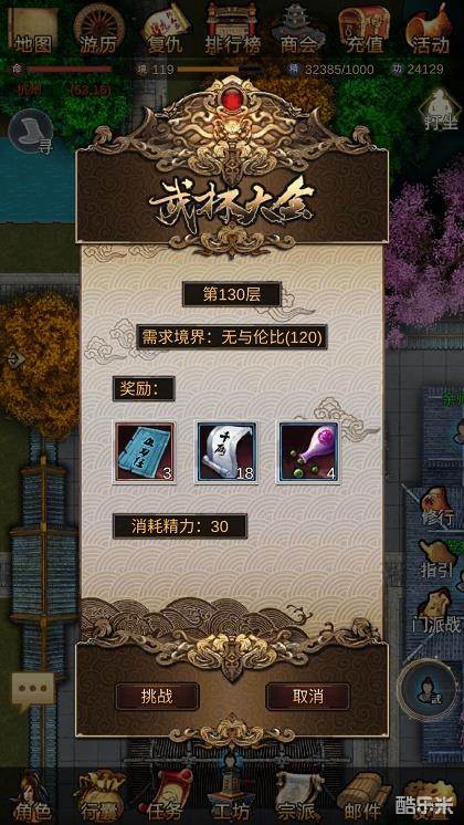 每次挑战消耗30点精力,挑战成功可获得武学秘籍、银票、修为丹及刺穴金针等丰富奖励。