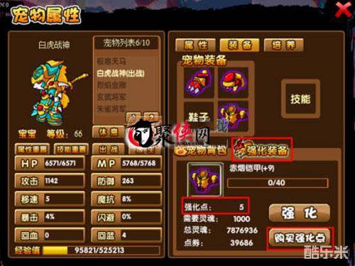 宠物装备强化系统,同学们可以通过任务获得强化点,消耗强化点和灵魂,可以对宠物装备进行强化,通过不断强化装备的属性和品质会得到提升。