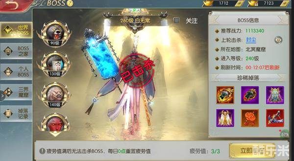 每击杀一次BOSS就会增加一点疲劳度,多以要有选择性的击杀BOSS哦,因为各等级的BOSS掉落类型也是有所区别的。可是我疲劳值满了还想打BOSS怎么办?(小编:BOSS心里苦)当然,如果疲劳值满了还可以使用疲劳消除药水哦,这样我们就又可以和BOSS开开心心的打一场了(BOSS:我可以回去休息吗,不打了不打了)