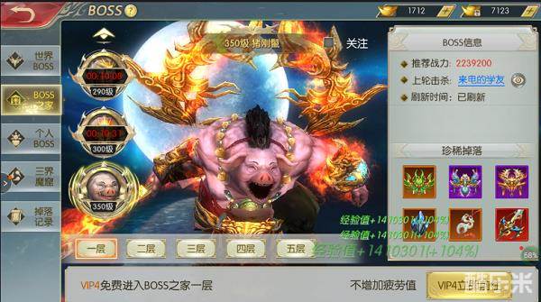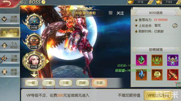 嫌弃世界BOSS疲劳度限制?那么BOSS之家就很推荐哦,但是BOSS之家需要VIP4才能进入哦。相比起世界BOSS,BOSS之家的掉落也是很丰富的,高阶装备快来我怀里~