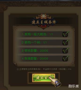 我们可以找到自己所在的州,首先目标统一州。玩家可以通过小地图看到13个州的位置,以及每个州包含的城池信息。在游戏中,我们需要攻打下这个州的所有城池,打开右下角的称帝界面,后选择建立主城,我们就可以坐拥一个州了。统一州有什么好处呢?首先统一州会带来资源的收益,可以为玩家增加20%的铜钱产量和粮草产量。第二,玩家的行军时间会缩短一半(节省一个行军加速)。第三,统一州后,该州所有的城池城墙防御会增加50%。是不是很有诱惑呢!