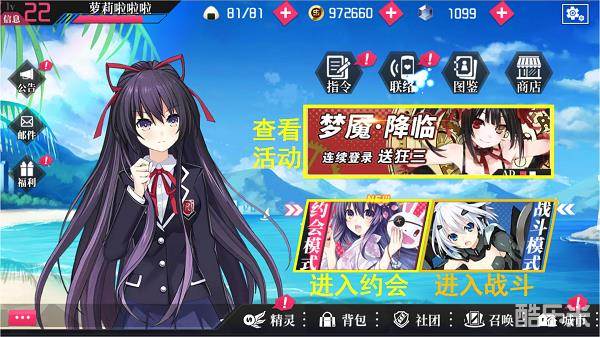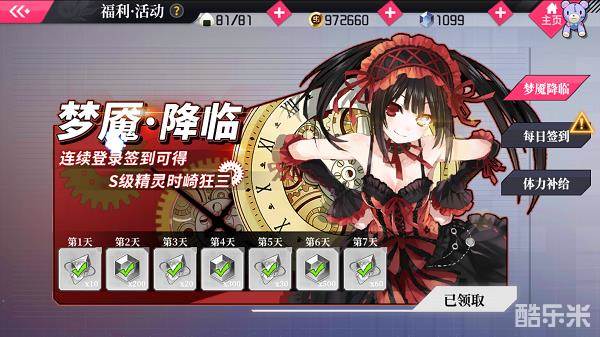 【梦魇降临】——连续登录七天即可获得精灵【时崎狂三】,对于三党来说可是一波福利啊,普通玩家也可以坚持登录获取一下,毕竟三三是游戏里的S精灵,获取难度系数也不大。