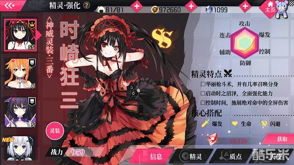 【灵装搭配】类似于精灵的装备,拥有不同等级的质点,而且不同的的质点搭配会有额外的加成,这里就不过多去挖掘,而在质点上方,有着一个过载度,如果超过这个过载度将会搭配失败,过载度会随精灵等级提高而提高。