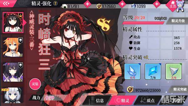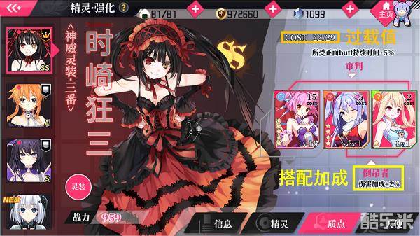 除了一个明显战斗力(啊……我是菜鸡)旁边还有一个【助战】标识,点击后,就可以切换助战了,这里以狂三为例,切换后头像也会随着切换的精灵切换。