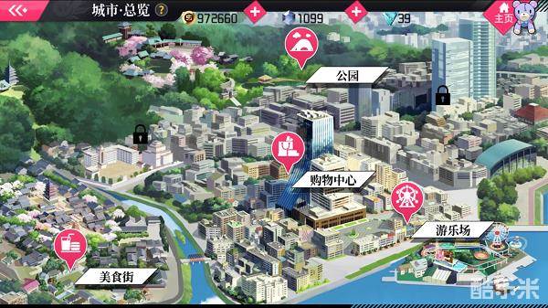 打开城市的界面,会有几个固定的地方(会随玩家等级增加解锁),目前开放地点有【美食街】【购物中心】【游乐场】【公园】
