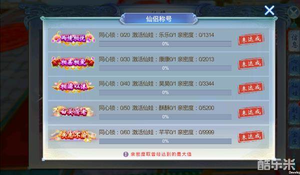 结婚后即可逐步获得仙侣专属称号,每个称号的获取条件不同,需要仙侣双方一起培养心锁、孕育仙娃、提高亲密度等。只要相爱的两个人一起携手,就能从“两情相悦”一路走到“白头偕老”,最终创造“矢志不渝”的爱情神话!