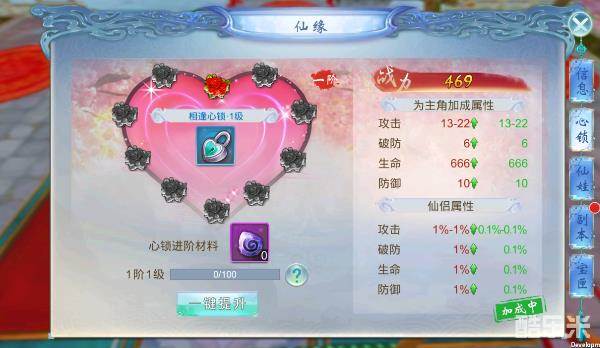 激活心锁后可使用三生石对心锁进行培养,进而提升心锁等级,为主角加成更多属性。三生石通过每日挑战情缘副本即可获得,记得每天都要参与哟!另外需要注意的是,仙侣属性需要玩家拥有仙侣才可以生效,单身的玩家可就有点吃亏了呢。