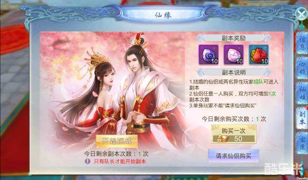 仙侣任意一人购买,双方均会增加一次副本次数。