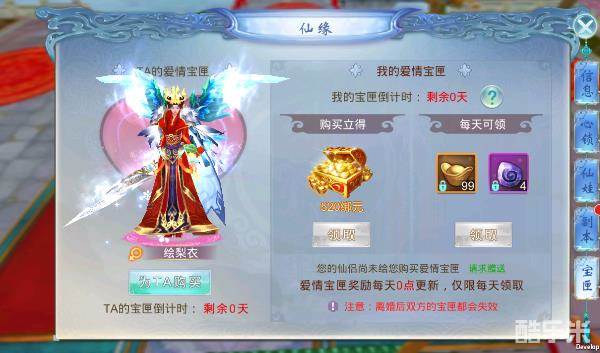 激活后即可领取1次520绑元奖励,并且持续30天每天都能领取1份日常奖励,真的非常超值划算!但如果仙侣双方离婚,则两个人的爱情宝匣都将失效,大家离婚前可要三思哟!
