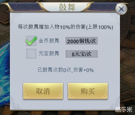 进入副本之后,副本中间会不断刷新怪物,右上角有鼓舞可选择,鼓舞每次可以增加人物10%的伤害,最多鼓舞10次,前5次鼓舞消耗铜钱,后5次鼓舞消耗元宝;
