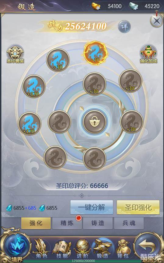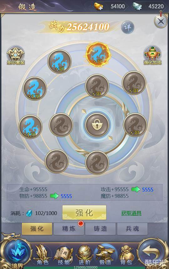 神印强化需消耗五行晶魄,每强化1次增加一定熟练度,熟练度满则强化等级提升,根据神印的阶级,强化上限不一样,不同部分的强化属性不一样,强化只增加神印的基础属性,不强化五行属性