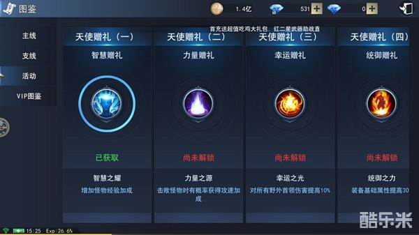 《天使圣域》活动图鉴拥有多种增益被动技能,玩家需要完成对应的赠礼活动才能解锁。注意!VIP图鉴只有两个技能,需要VIP1和VIP4解锁,但技能效果突出,玩家可根据自己的实际需求,开通对应的VIP。