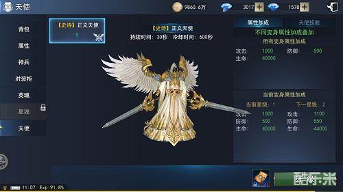 《天使圣域》的天使变身可以进行升级,通过挑战“天使试炼”副本,获得道具“天使契约”,即可完成升级。天使变身升级后,可以提升攻击、防御、生命等属性加成,从而进一步提升变身的威力。