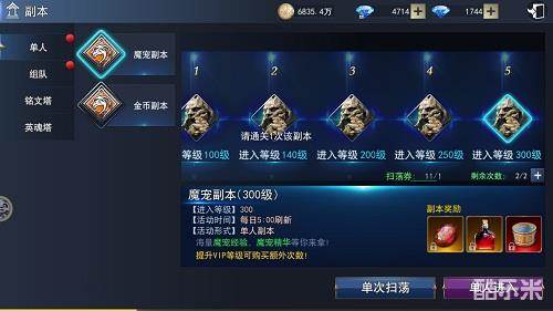 《天使圣域》中有着丰富的日常玩法与副本,例如魔宠副本、金币副本、经验副本等等。以魔宠副本为例,使用扫荡券进行扫荡,就可以立即完成该副本,并获得对应的道具奖励,非常方便。