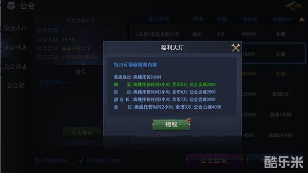 公会成员每天都可以在福利大厅中领取福利,职务越高福利越好